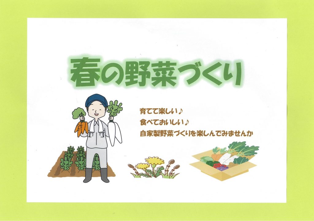 | 内容 | 春! 今年も自家製野菜づくりを楽しんでみませんか! あなたにあった方法が見つかるといいですね。 |