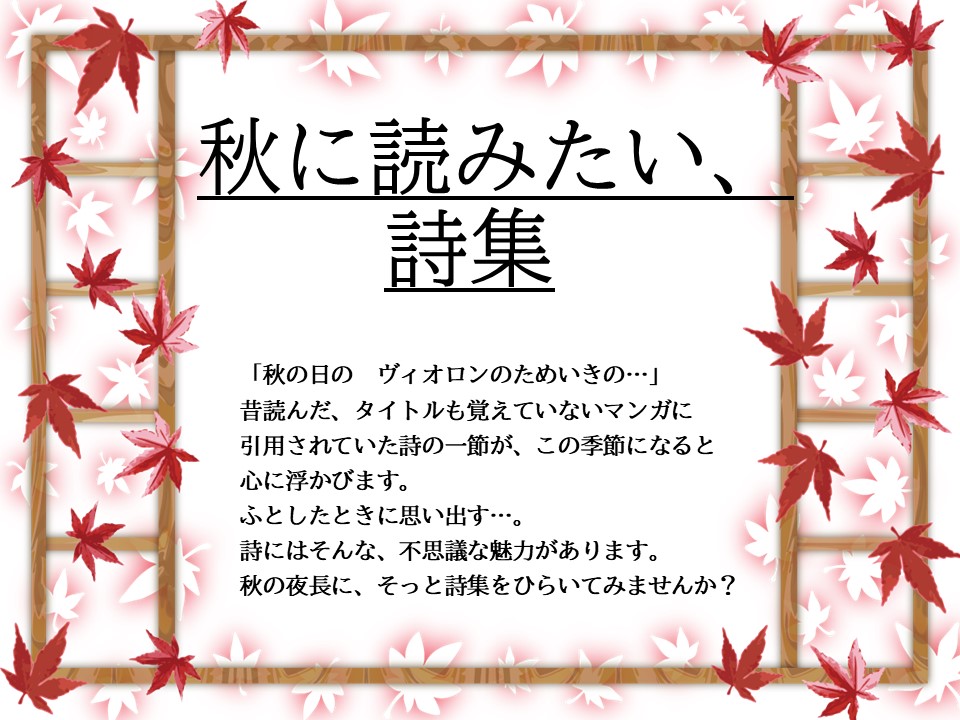 内容 | 「秋の日の ヴィオロンのためいきの…」 昔読んだ、タイトルも覚えていないマンガに引用されていた詩の一節が、この季節になると心に浮かびます。 ふとしたときに思い出す…。詩にはそんな、不思議な魅力があります。 秋の夜長に、そっと詩集をひらいてみませんか? |