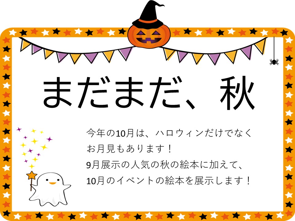 内容 | 10月はハロウィンだけでなく、今年はお月見もあります。 9月展示の人気の秋の絵本に加えて、10月のイベントの絵本も展示します。 |