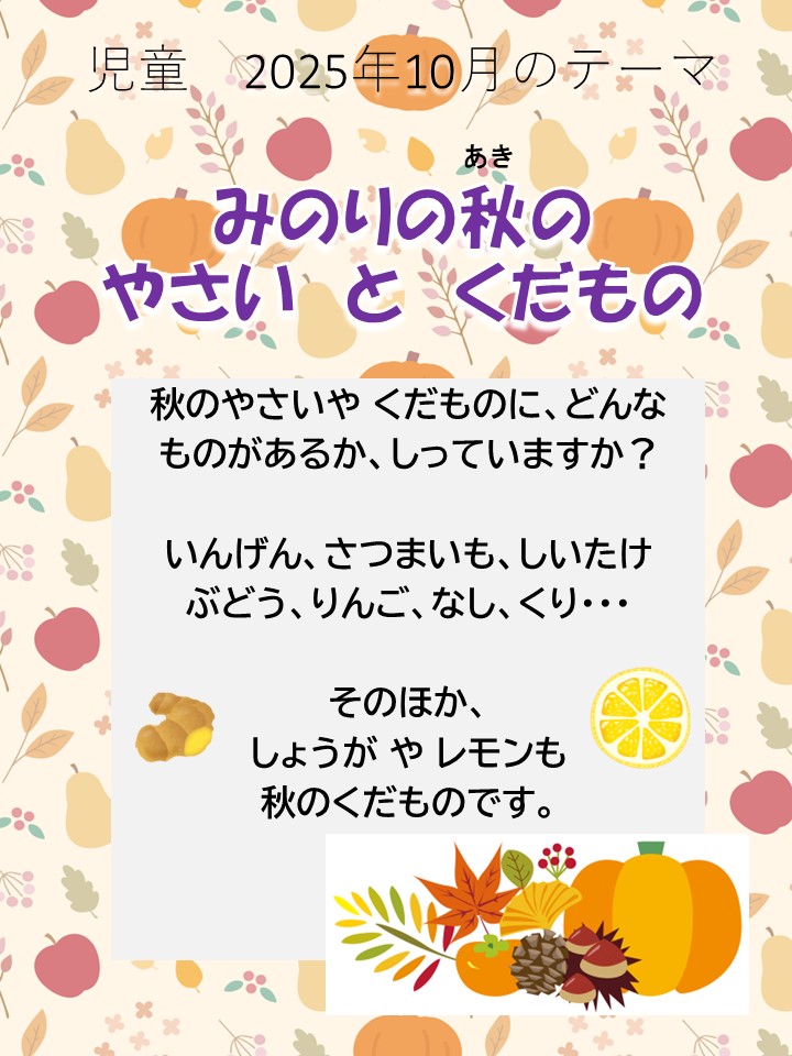 内容 | 秋は、夏の太陽の光で育った野菜や果物の収穫時期です。おいしく食べて寒い夏に負けない体を作りましょう! |