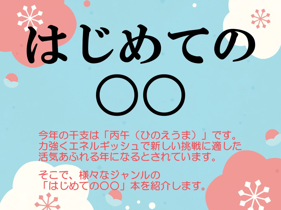 | 内容 | 今年の干支は「丙午(ひのえうま)」です。力強くエネルギッシュで、新しい挑戦に適した活気あふれる年になるとされています。 そこで、様々なジャンルの「はじめての○○」本を紹介します。一年の始まりに、新しいことにチャレンジしてみませんか。 |