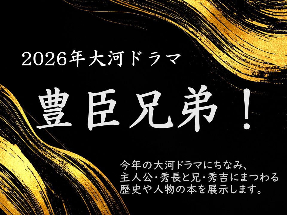 | 内容 | 2026年の大河ドラマは『豊臣兄弟!』 貧しい農家から天下人になる兄・秀吉と、それを支える弟・秀長が、数々の困難を乗り越え、太平の世を目指す奇跡の物語です。 ドラマにちなみ、秀吉・秀長にまつわる歴史や人物の本を展示します。 |