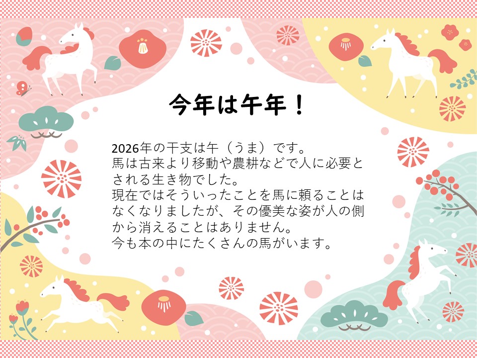 | 内容 | 2026年の干支は午(ウマ)です。 馬は古来より移動や農耕などに人に必要とされる生き物でした。 現在ではそういったことを馬に頼ることはなくなりましたが、その優美な姿が人の側から消えることはありません。 今も本の中にたくさんの馬がいます。 |