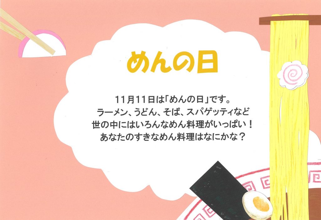| 内容 | 11月11日は「めんの日」です。 ラーメン、うどん、そば、スパゲッティなど世の中にはいろんなめん料理がいっぱい! あなたのすきなめん料理はなんですか? |