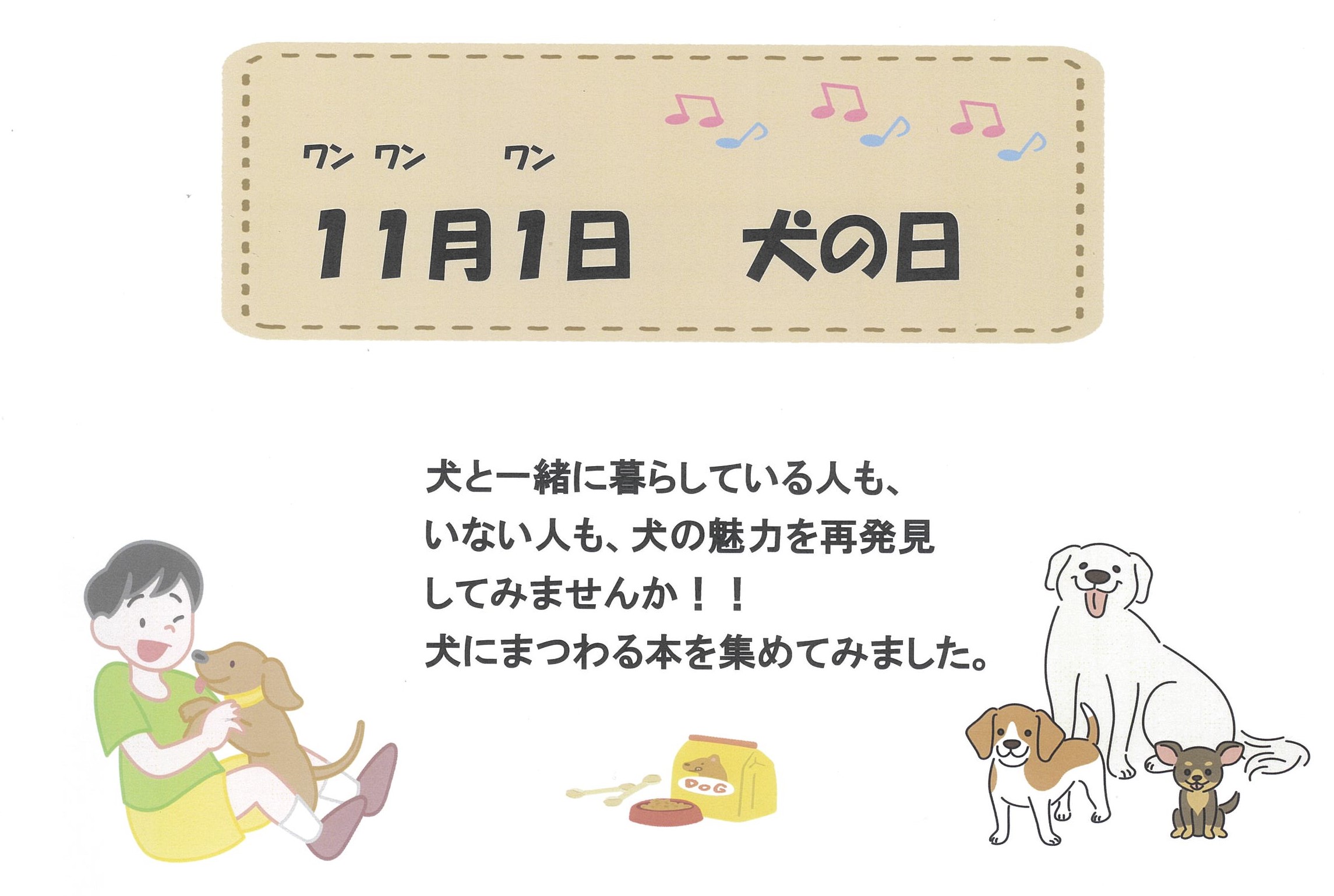 | 内容 | ワン・ワン・ワンという犬の鳴き声にちなみ11月1日が犬の日に定められました。犬と一緒に暮らしている人も、いない人も犬の魅力を再発見してみませんか!犬にまつわる本を集めてみました。 |
